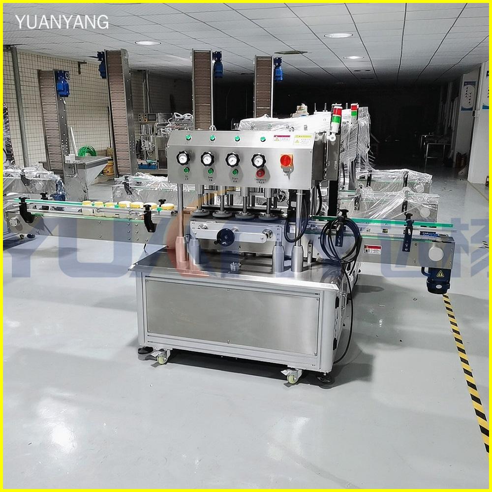 Yuanyang automatic screw capping machine is a kind of four-wheel bottle capping machine. The automatic screw capper is often used to close lids of containers such as bottles and jars, especially for plastic bottles, which are widely used in food, medicine, chemical, cosmetic, and other industries for mass production and continuous production lines.